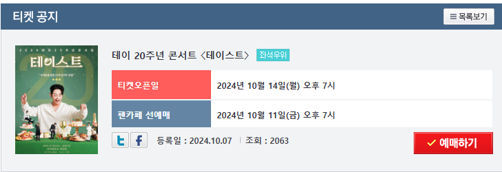 팬카페 선예매는 테이의 공식 팬카페 TENIA에서 진행되며, 팬클럽 인증을 받은 회원들만 예매 가능합니다. 일반 예매는 팬카페 선예매 이후 바로 시작되니 빠르게 예매를 진행하셔야 합니다! 💨